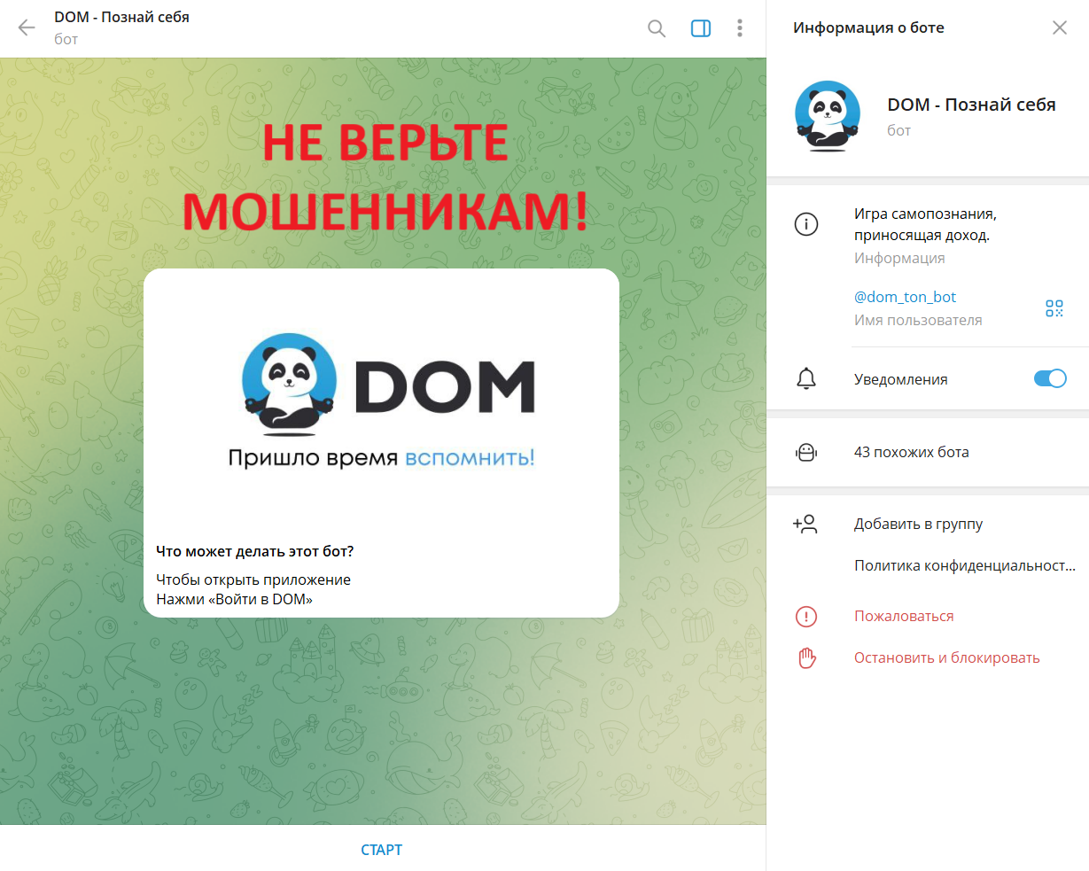 В популярном мессенджере Телеграм практически каждый может быть коучем, трейдером, гуру или же проводником в мир легкого и стабильного заработка. Однако далеко не каждый «специалист» является таковым на самом деле. Сегодня мы поговорим о проекте с названием DOM — Познай себя. Создатели бота обещают пользователям путь к пробуждению, перерождению, финансовому благополучию. Отметим, что обертка у ресурса действительно привлекательная. Но что скрывается за ней?