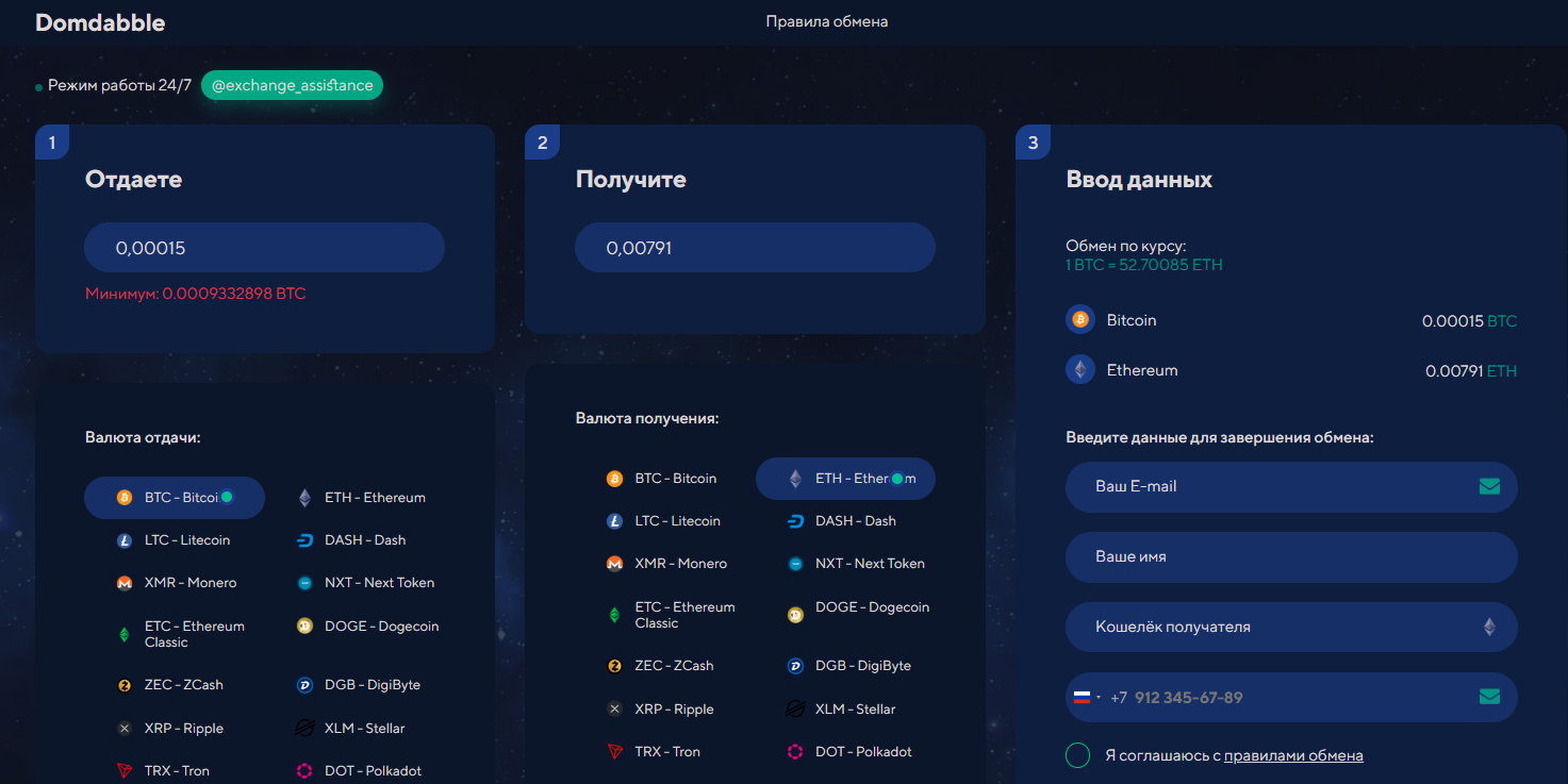 Что можно сказать о честности Domdabble? Лишь то, что ее здесь нет. Обменный пункт отсутствует в списках авторитетных мониторингов. О его собственниках ничего не известно. Лицензированием и регулированием сервис не обладает (что указывает на его незаконную работу). Рабочих контактных данных в пространстве не представлено.