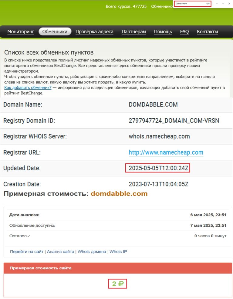 Данный сервис используют исключительно для выманивания средств с наивных юзеров. Доказательством тому служат парочка выявленных в пространстве признаков мошенничества. Одним из них является возраст площадки. После ее анализа на специализированном портале можно узнать, что сайт был зарегистрирован 13 июля 2023 года, но функционировать начал лишь 5 мая 2025. Этот аспект указывает на молодость обменника. Однако его основатели решили добавить себе «опыта», заявив в рекламных материалах о своей продолжительной работе.