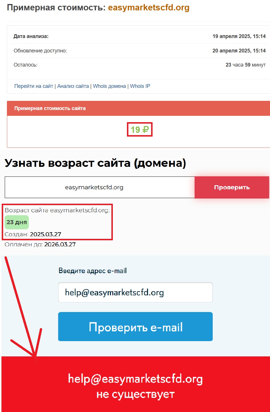 Отдельно хочется сказать о сроке существования площадки. Тут и говорить особо нечего — 23 дня. Это даже не месяц. О каком доверии может идти речь? Такая площадка может исчезнуть в любой момент — как только соберет нужную сумму с доверчивых клиентов. И все. Следа не останется. Из контактной информации только фейковая почта help@easymarketscfd.org.
