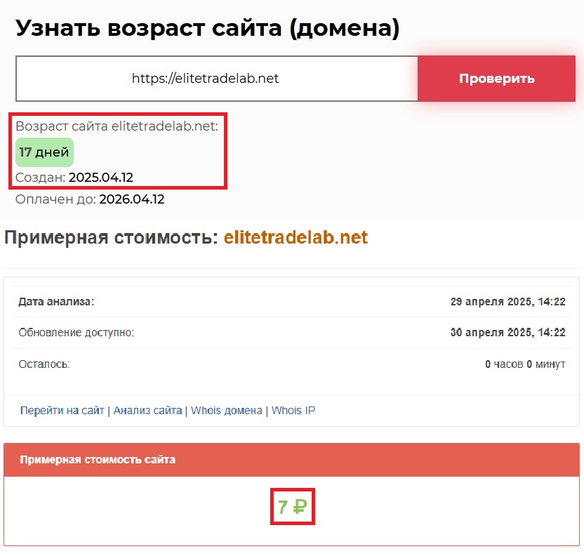 Конечно, нет. Проверка домена показала: площадка существует чуть больше двух недель, с 12 апреля 2025 года. А ведь они рассказывают про “многолетний опыт” и “тысячи довольных клиентов”. Но куда деваются эти клиенты, когда вы пытаетесь с ними связаться? Правильно, их просто не существует. Столько уже было таких “проектов” — создаются быстро, собирают деньги и исчезают. EliteTradeLab — просто очередной из них.