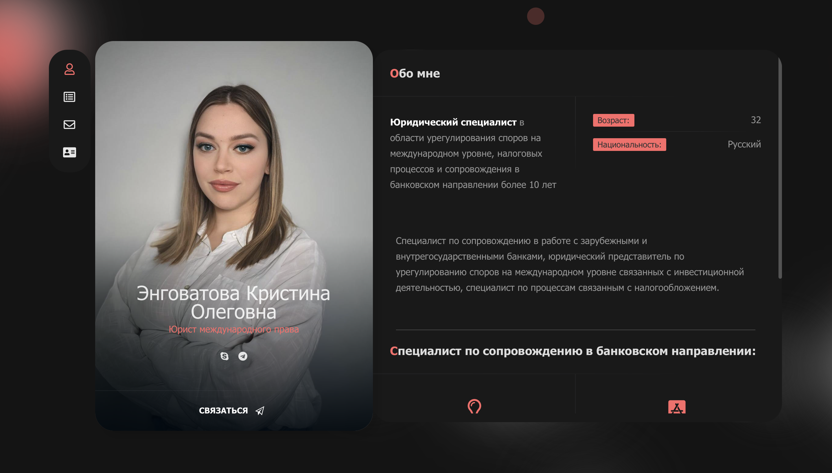 Здесь нет никаких уникальных решений, никакого понятного описания услуг, никаких важных сведений. О такой себе Кристине Олеговной представлено немало фактов. Но проблема в том, что практически ни один из них не подтвержден. Реальные официальные документы (которые могли бы свидетельствовать о наличии разрешения на ведение деятельности в юридической сфере) отсутствуют. Этот момент указывает на незаконность работы Энговатовой.