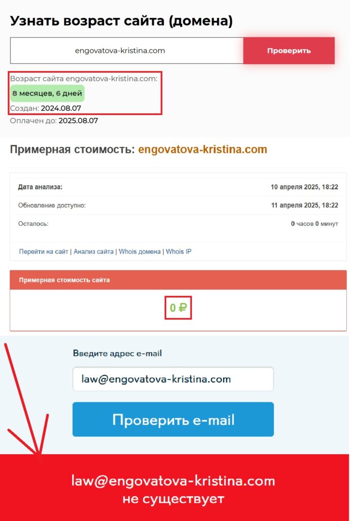 Домен engovatova-kristina.com зарегистрирован всего несколько месяцев назад и создан он на базе стандартного и дешевого шаблона, который часто используется в подобных мошеннических проектах. О банальности выбранного жуликами дизайна свидетельствует примерная стоимость, равна 0 рублей.