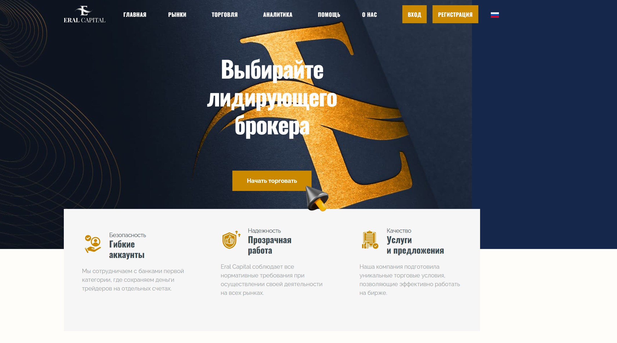 Давайте не будем ходить вокруг да около. Сайт eralcapital.ltd сразу дает понять, с кем мы имеем дело. Он выглядит, мягко говоря, неубедительно. Все слишком просто, слишком дешево. Дизайн словно слеплен на скорую руку из чужих заготовок. Сложилось ощущение, что авторы не особо старались — лишь бы выглядело “брокерски”. Но, увы, кроме внешнего антуража за этим проектом ничего не стоит. Ни технологий, ни аналитики, ни команды, ни хотя бы одного признака настоящей работы с рынками.