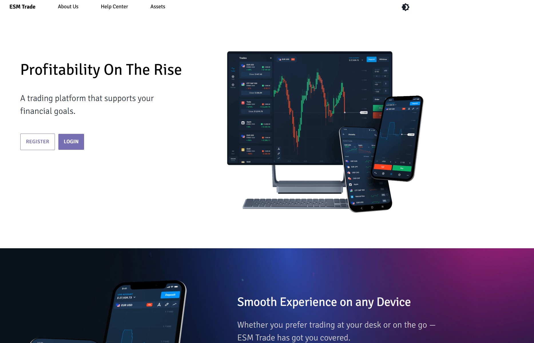 Разумеется, мы решили разобраться. И первое, с чем сталкивается пользователь — это сайт esmtradecoperation.live. Именно с него все начинается. И, честно говоря, начинается все очень плохо. Визуально — типичный шаблон. Такой, который до этого уже десятки раз использовался другими «псевдоброкерами». Никакой индивидуальности. Все вторично. Примитивно, шаблонно, по-накатанной. Откуда такая уверенность? Очень просто: такие конструкции, как правило, копируются целиком, а потом используются для обмана снова и снова, меняя лишь название и логотип.
