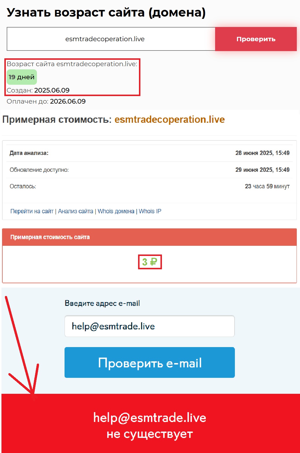Кстати, домен стоит ровно три рубля. Смешно? Возможно. Но это наглядно демонстрирует: на развитие проекта не тратилось ничего. Ни сил, ни ресурсов. И уж точно — никакой заботы о клиентах. Как насчет связи с представителями? Теоретически — вы можете написать на адрес help@esmtrade.live, вот только он фейковый.