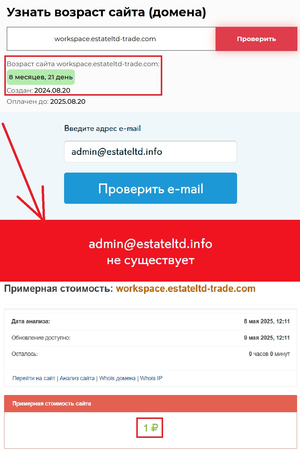 А теперь давайте взглянем на факты. Возраст домена — чуть больше восьми месяцев. Ну серьезно, вы бы доверили свои деньги компании, которая не проработала на рынке и года? Вряд ли. Да и стоимость самого сайта — один рубль. Это даже не шутка, просто ноль. Ни вложений, ни инвестиций, ни интереса в развитие. Все сделано наспех, и это чувствуется. Ну и еще один момент: как вы свяжетесь с этими «представителями»? Правильно — никак. Ни одного живого контакта, ни телефона, а почта admin@estateltd.info фейковая.