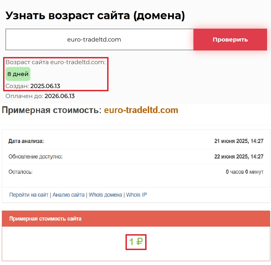 И вот здесь начинается самое интересное — сайт оценивается всего в один рубль! Серьезно, вы действительно верите, что за такие деньги можно построить серьезный и прибыльный бизнес? Домен зарегистрирован 8 дней назад, 13 июня 2025 года. То есть проект появился совсем недавно, и, судя по всему, достаточно быстро приобрел негативную репутацию.