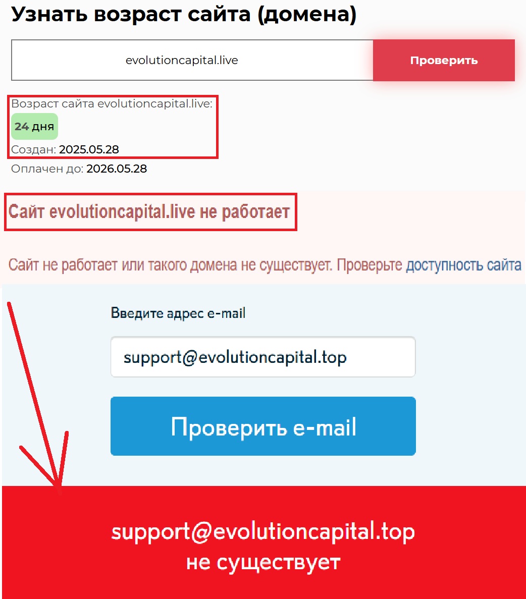 Что касается срока существования проекта — здесь вообще все становится очевидным. Мы провели стандартную проверку через сервис Whois, и он показал, что Evolution Capital Investment существует всего 24 дня. Скажите, можно ли за это время выстроить надежную репутацию, наладить юридические механизмы, сформировать команду, пройти регистрацию у регуляторов и начать честную работу? Мы в этом очень сомневаемся. И вам советуем задуматься.