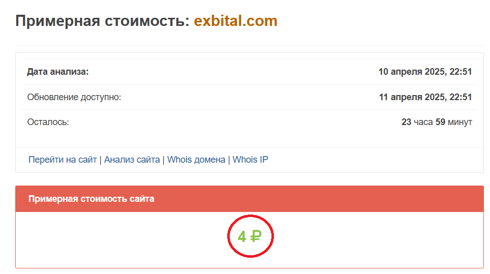 Прежде всего предлагаем обратить внимание на дату регистрации домена: 28 марта 2025 года. Площадка существует всего 2 недели. И при таких раскладах ее владельцы не стесняются громко заявлять о надежности и серьезности. Это очень подозрительные рассказы, как для сервиса, не проработавшего и года, и абсолютно никак не доказавшего своего качества. Дальше хочется отметить малую примерную стоимость сайта, которая составляет всего 4 рубля. Это слишком низкий показатель, как для якобы хорошей и перспективной биржи.