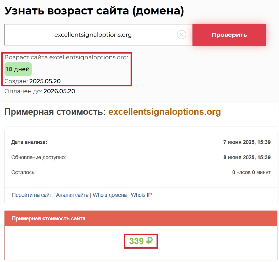 Мы попытались провести базовую проверку. И, честно говоря, результаты оказались даже хуже, чем мы ожидали. Согласно данным сервиса Whois, проект существует всего 18 дней. И при этом — столько громких заявлений. Где вы видели, чтобы за такой срок компания выстроила целую финансовую империю? Это невозможно. Особенно без лицензии, без аудиторов, без хоть какой-то юридической документации. А у Excellentsignaloptions — ничего этого нет.