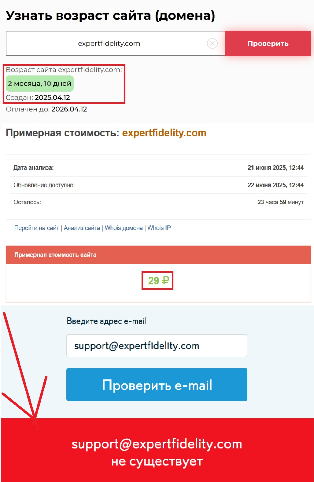 Вопросы начинаются и с технической стороны. Мы провели проверку домена, использовали популярные сервисы — и тут всплыло то, о чем представители Expertfidelity вряд ли захотят говорить. Оказывается, сайт существует всего чуть больше двух месяцев. Дата регистрации — 12 апреля 2025 года. За это время никто не может набрать ни солидной клиентской базы, ни тем более — миллионных оборотов.
