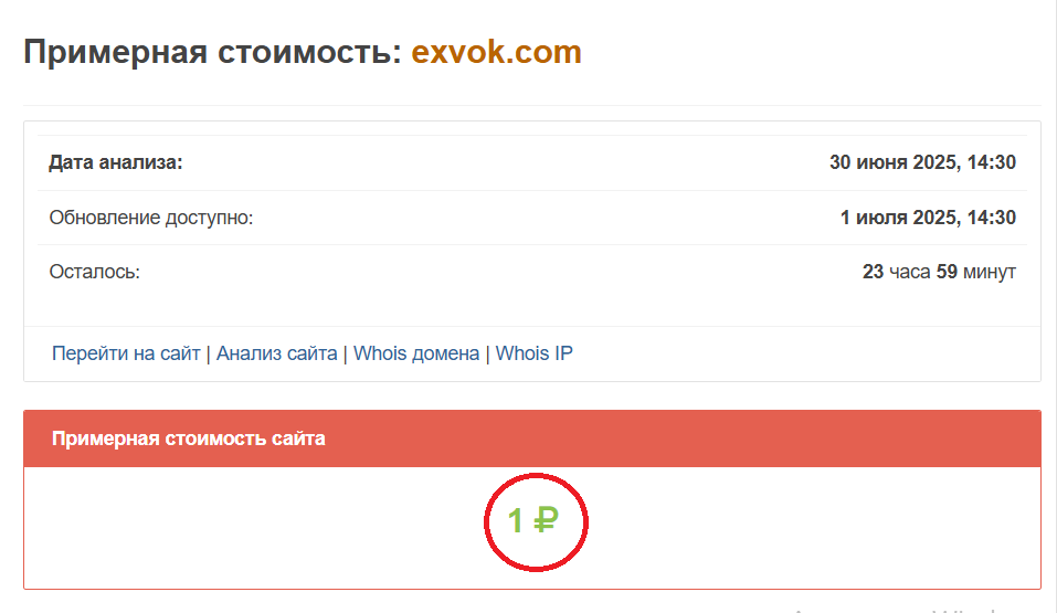 При проверке ресурса было обнаружено несколько признаков недобросовестности. Во-первых, предлагаем обратить внимание на домен кошелька. Он был зарегистрирован 30 апреля 2024 года. Его примерная стоимость составляет всего 1 рубль. Ни первый, ни второй показатель неприемлемы для действительно серьезного и надежного пространства.