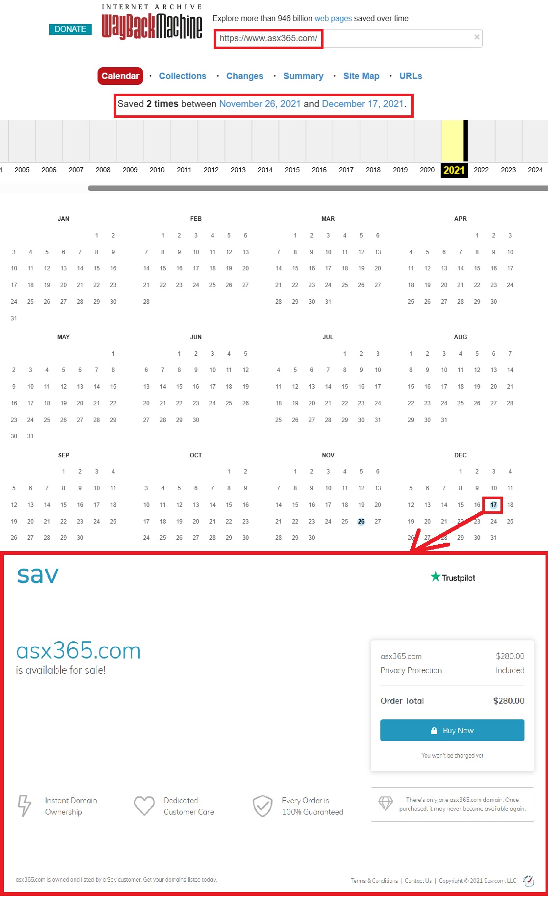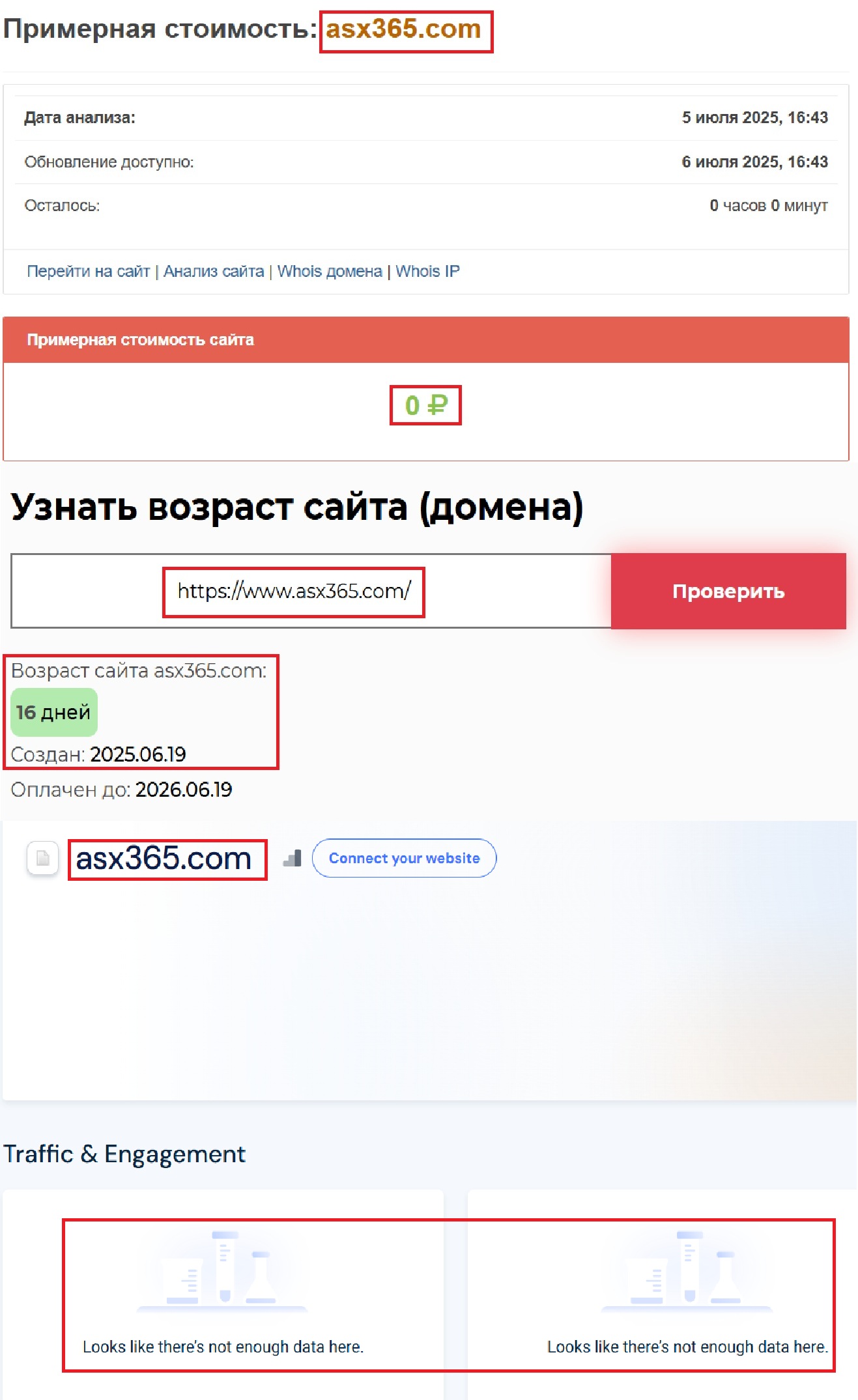 Первая и главная зацепка — возраст сайта. Сервис Whois (https://who.is/whois/asx365.com) честно показывает: домен создан 19 июня 2025 года. Не 2020, не 2019 и уж тем более не 2018, как указано в футере сайта, а чуть больше двух недель назад. И это при том, что на сайте расписана целая «легенда» о многолетнем опыте и тысячах довольных клиентов. Проверяем архив через Wayback Machine (https://web.archive.org/web/20211217184642/http://asx365.com/), где хранятся копии внешнего вида сайтов — и находим, что asx365.com был выставлен на продажу в 2021 году. Просто старый домен, который выкупили и переделали под инвестиционную платформу. Типичная история.