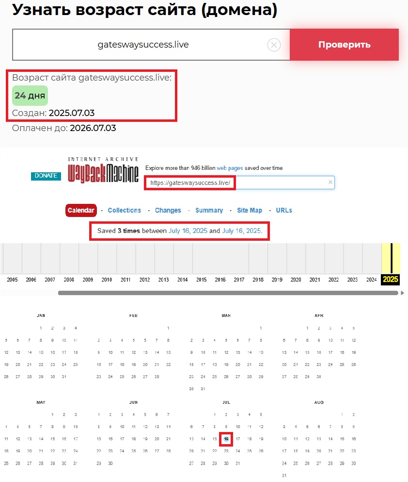Для начала — проверяем Whois (сервис, где видно владельца домена и дату регистрации). Выясняется: домен был зарегистрирован 3 июля 2025 года, то есть 24 дня назад, хотя платформа заявляет о “работе на рынке на протяжении многих лет”. Далее смотрим в Веб-Архив — интернет-архив, где сохраняется внешний вид того или иного сайта за время его существования. Архива GATESWAYSUCCESS до 16 июля 2025 года нет — сайт появился внезапно. То есть вся история — выдуманная маркетинговая легенда.