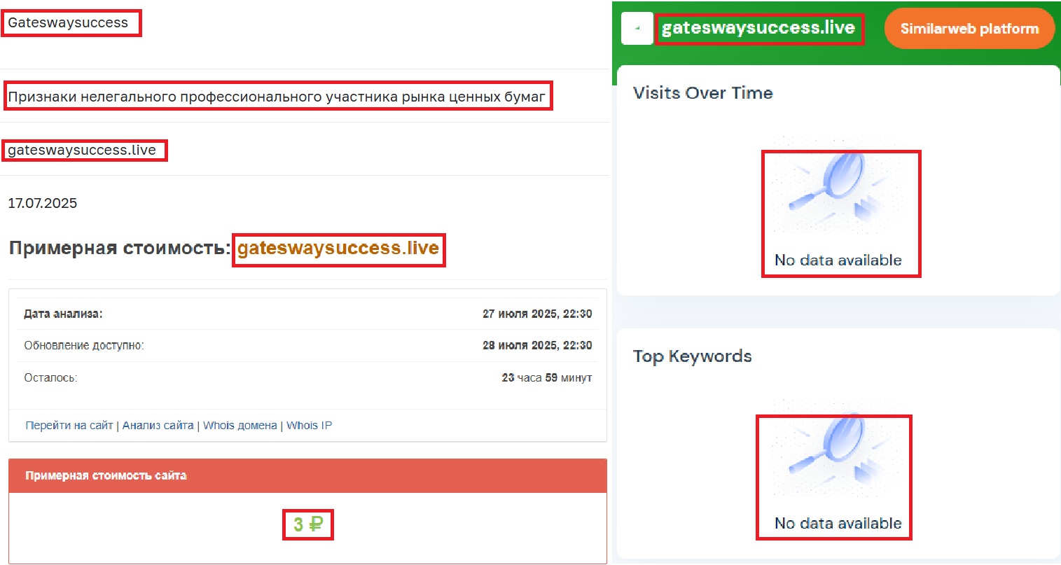 Анализ через Seolik (оценка стоимости сайта) показывает, что ресурс обошелся владельцам в жалкие три рубля. Посещаемость, судя по SimilarWeb (инструмент для оценки трафика), на нуле — реальных пользователей, похоже, нет. И самое главное — gateswaysuccess.live уже в черном списке такого авторитетного регулятора как Центробанк РФ (http://www.cbr.ru/inside/warning-list/detail/?id=39023).