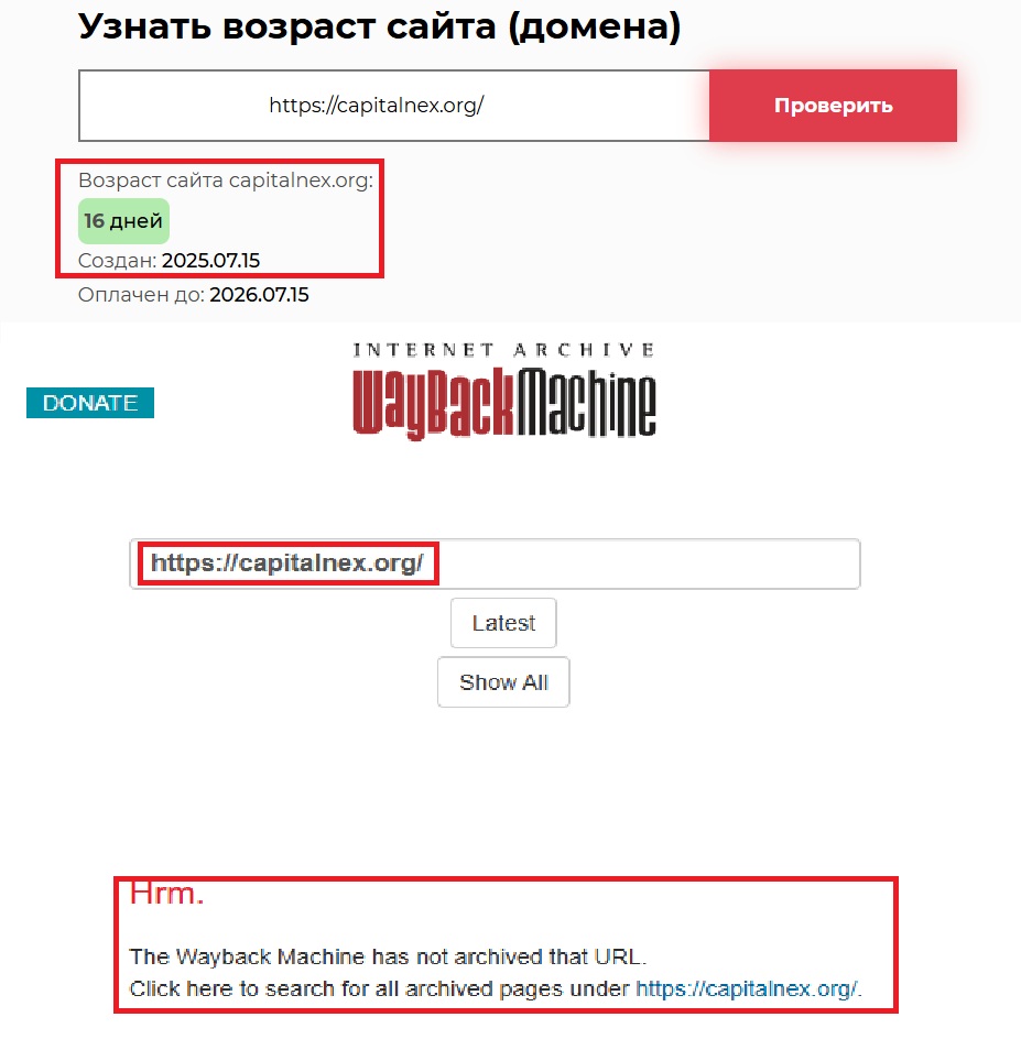 Whois (https://who.is/whois/capitalnex.org) — сервис для проверки информации о домене — показал, что сайт зарегистрирован буквально 16 дней назад. Capitalnex.org появился в сети всего несколько недель назад, и это легко проверить. А Веб-Архив, крупнейшая база интернет-архивов, показал, что у сайта нет никакой истории, ни одной сохраненной страницы в прошлом. Это означает только одно: проект создан на скорую руку исключительно для развода.