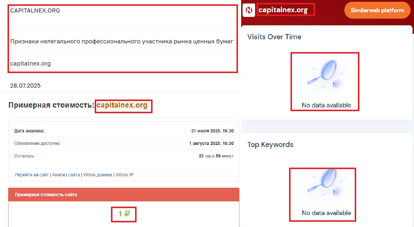 Начнем с анализа самого сайта. Через Seolik (сервис, позволяющий оценить рыночную стоимость домена) мы выяснили, что цена capitalnex.org составляет символический 1 рубль. Это говорит о нулевой деловой ценности ресурса. Далее проверили активность через SimilarWeb — он анализирует трафик сайтов. Результат: посещаемость нулевая. Никто туда не заходит, несмотря на заявления о “глобальной популярности”.