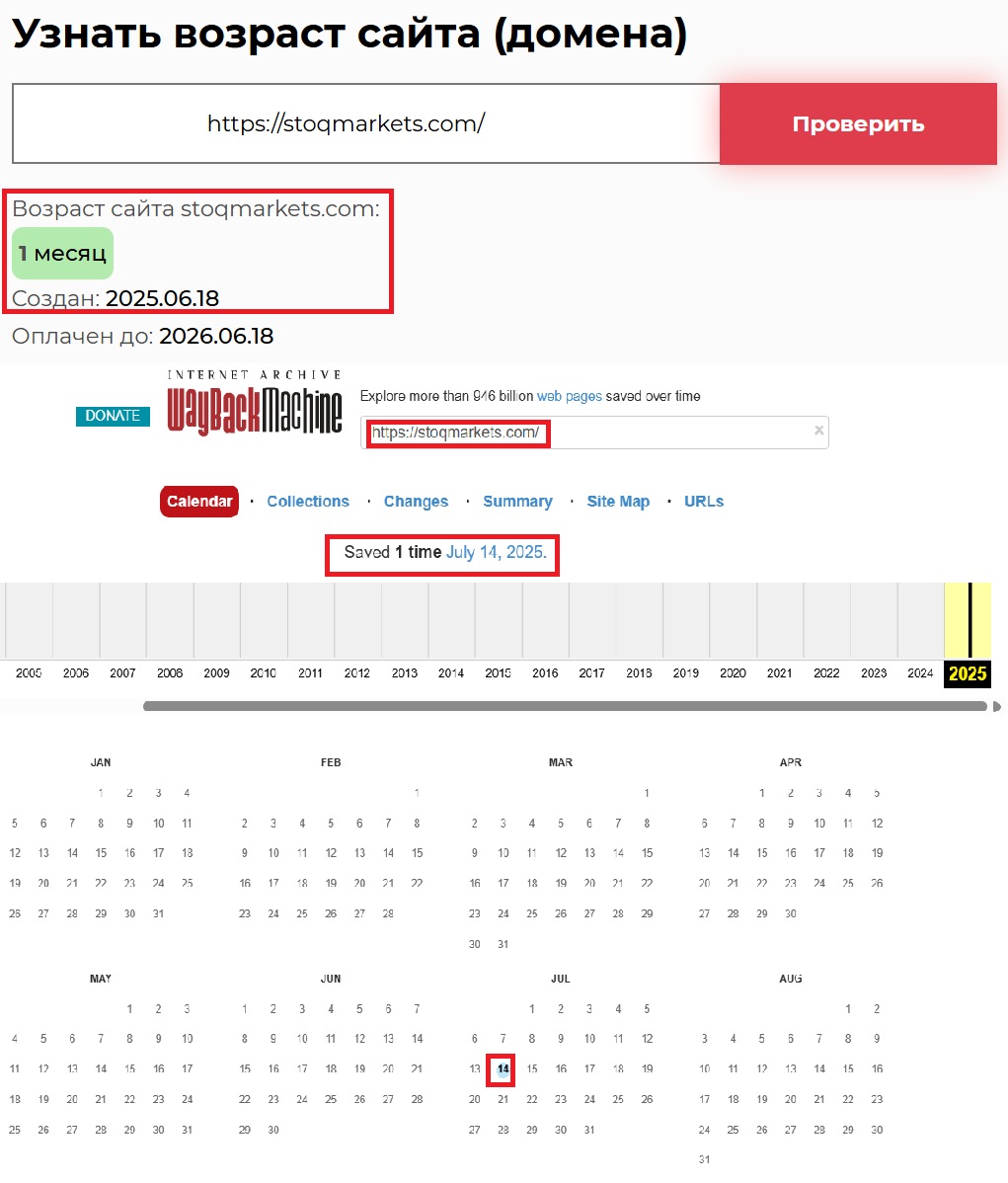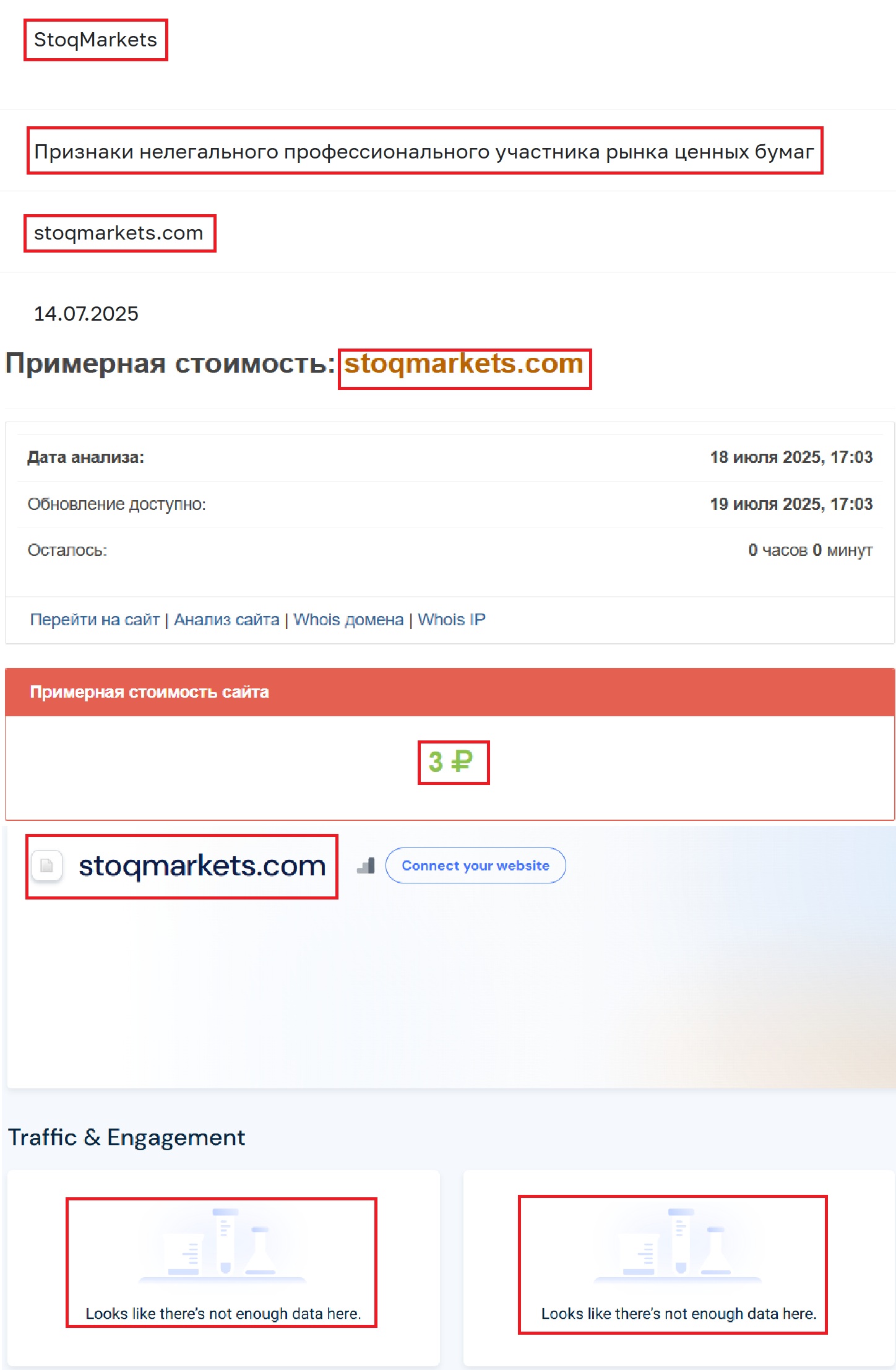 Если заглянуть в Веб-Архив (https://web.archive.org/web/20250000000000*/http://stoqmarkets.com/) — это сервис, фиксирующий историю сайтов — можно обнаружить, что первое упоминание о проекте появилось 14 июля 2025 года. Whois (https://who.is/whois/stoqmarkets.com) показывает, что домен зарегистрирован месяц назад, 18 июня 2025 года, а Seolik, оценивающий стоимость сайтов, определил ценность stoqmarkets.com на уровне 3 рублей — смехотворный показатель для якобы солидной инвестиционной компании. Ну и напоследок — SimilarWeb, сервис, отслеживающий трафик, указывает на почти полное отсутствие посещаемости. Это четко говорит о том, что перед нами не международный проект, а типичная однодневка.