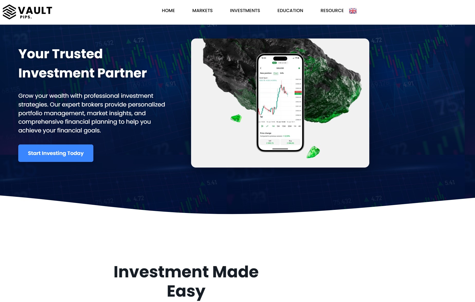 «Ваш надежный инвестиционный партнер!» — под таким ярким лозунгом Vault Pips (vaultpips.com) заманивает новых жертв. Жаль только что надежный этот проект только в краже ваших денег. На сайте обещают моментальные выплаты, авторские стратегии и гарантированную прибыль. Но на деле перед нами классический лохотрон, работающий под маской солидного брокера.