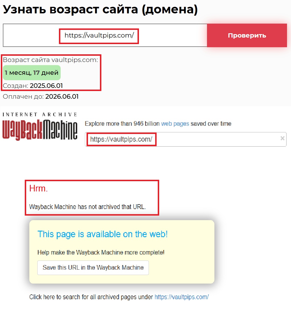 Теперь Веб-Архив (https://web.archive.org/web/20250000000000*/https://vaultpips.com/) — это архив интернета, где сохраняются старые версии сайтов. И вот незадача: для vaultpips.com нет ни одного снимка, ресурс только-только появился.