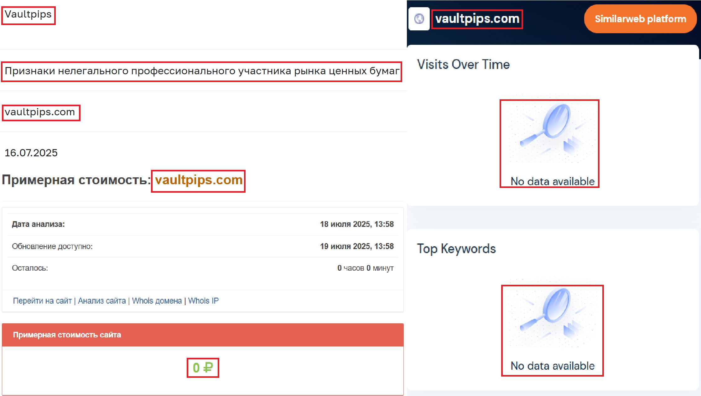 Далее — Seolik и SimilarWeb. Первый показывает техническую сторону сайта, второй — реальную посещаемость. Согласно Seolik, сайт дешевый — ровно 0 рублей, с минимальной защитой и непрофессиональным кодом. А по данным SimilarWeb, на платформу почти никто не заходит. Это говорит о том, что Vault Pips — просто пустышка.