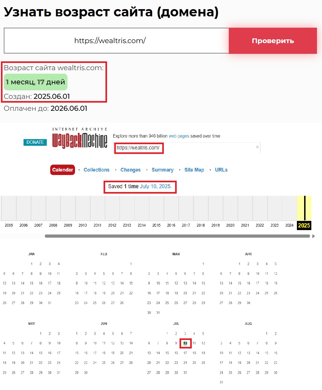 Заявления о “многолетнем опыте” легко разбиваются о факты. Через Whois (https://who.is/whois/wealtris.com) проверяем возраст домена — оказывается, он был зарегистрирован 1 июня 2025 года. Смешно читать о «10 годах на рынке», когда сайту от силы полтора месяца. Проверка через Веб-архив (https://web.archive.org/web/20250000000000*/https://wealtris.com/) тоже не оставляет сомнений — до 10 июля 2025 года упоминаний ресурса не существует. То есть все, что мы видим — новодел.