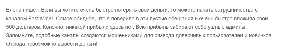 Поиск откликов о Fast Miner, как уже упоминалось, позволил найти только отрицательные сообщения от бывших клиентов ресурса. Одураченные люди призывают не связываться с этим лохотроном, дабы не разочароваться из-за несбывшихся надежд и не терять зря время, вложения.