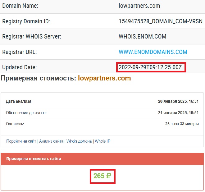 Проверка сторонними сервисами показала, что герой данного обзора использует для работы сайт, стоимость которого составляет ровно 265 рублей. Согласитесь, это крайне низкая стоимость для легального проекта. Будем откровенны, аферисты также и купили старый домен 29 сентября 2022 года, но потом они скрыли информацию об обновлениях, чтобы создать иллюзию легальности и правовой работы компании.