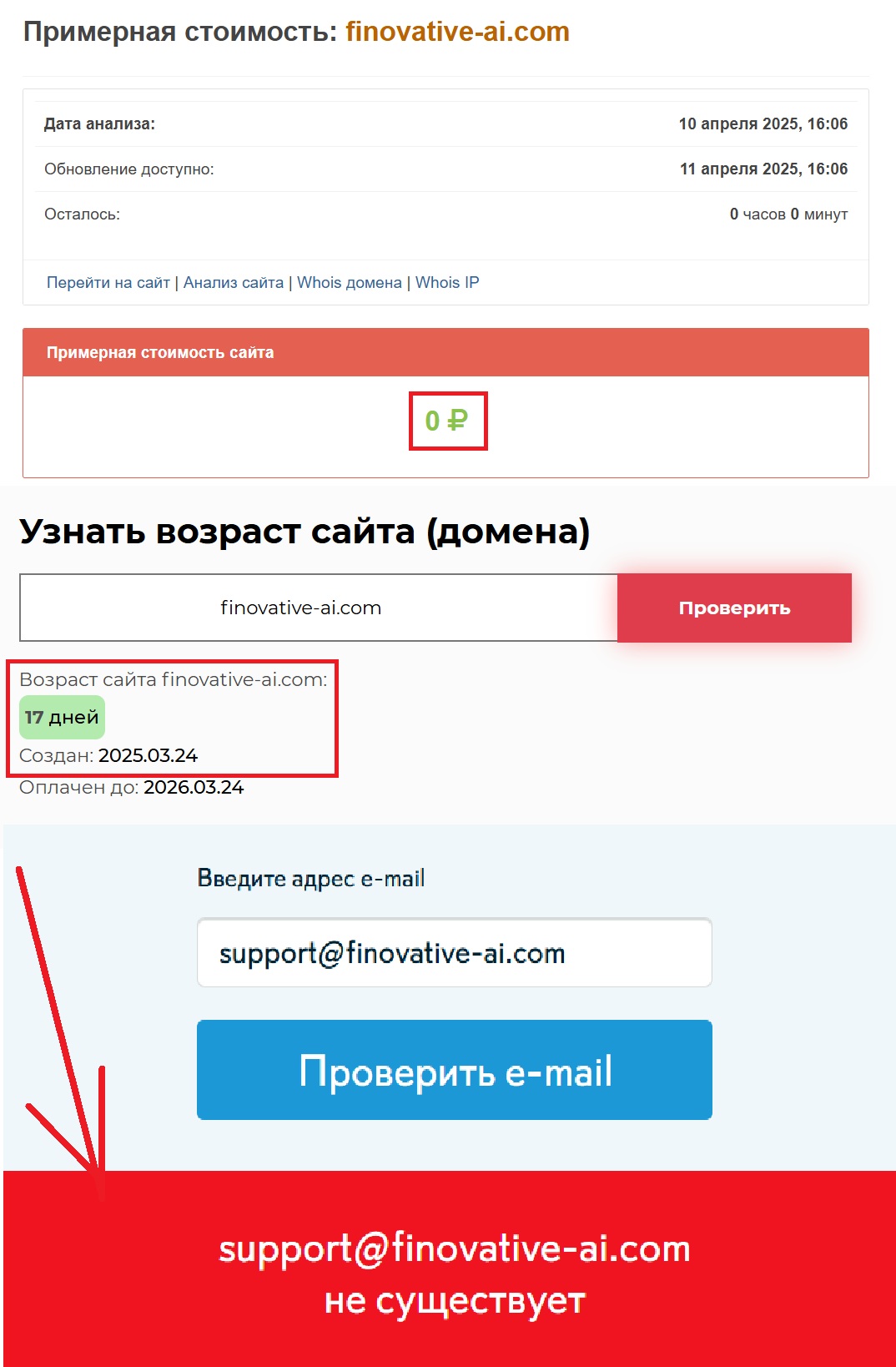 Проект, как выясняется, существует чуть меньше месяца. Конкретнее — с 24 марта 2024 года. А между тем на сайте бодро говорится о многолетней истории и успешной практике в разных странах. Мол, Чехия, Великобритания, и где только они не успели себя проявить. Вот только никакой официальной регистрации там нет. А заявленная электронная почта support@finovative-ai.com? Написать вы, конечно, можете. Но вряд ли кто-то вообще прочитает ваше письмо. А уж ответить — и подавно.
