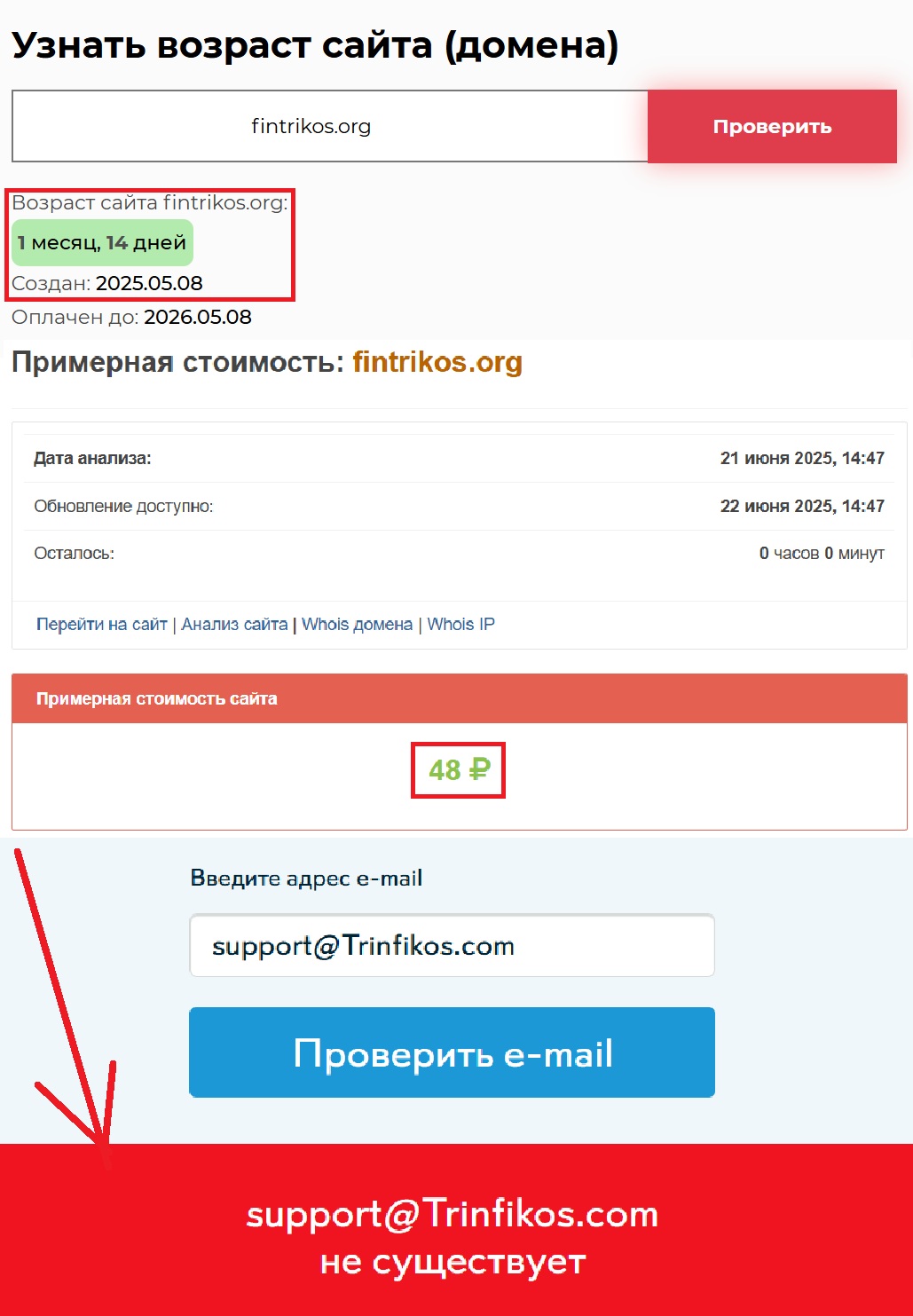 Контактов у проекта практически нет. Ни адреса, ни телефона, только фальшивая почта support@Trinfikos.com и форма обратной связи, которая, по большому счету, работает исключительно в одну сторону. Вам позвонят, конечно — но не удивляйтесь, если номер окажется случайным, а оператор будет навязчиво уговаривать «вложиться еще немного».
