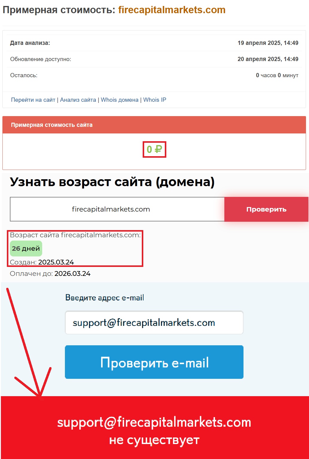 Что касается самой платформы Fire capital markets, то она существует меньше месяца — 26 дней. Создана 24 марта 2025 года — и это не наши догадки, а проверенный факт. Срок, прямо скажем, не внушает доверия. А если добавить сюда еще и нулевую стоимость ресурса — совсем становится ясно: перед нами не компания, а фикция.