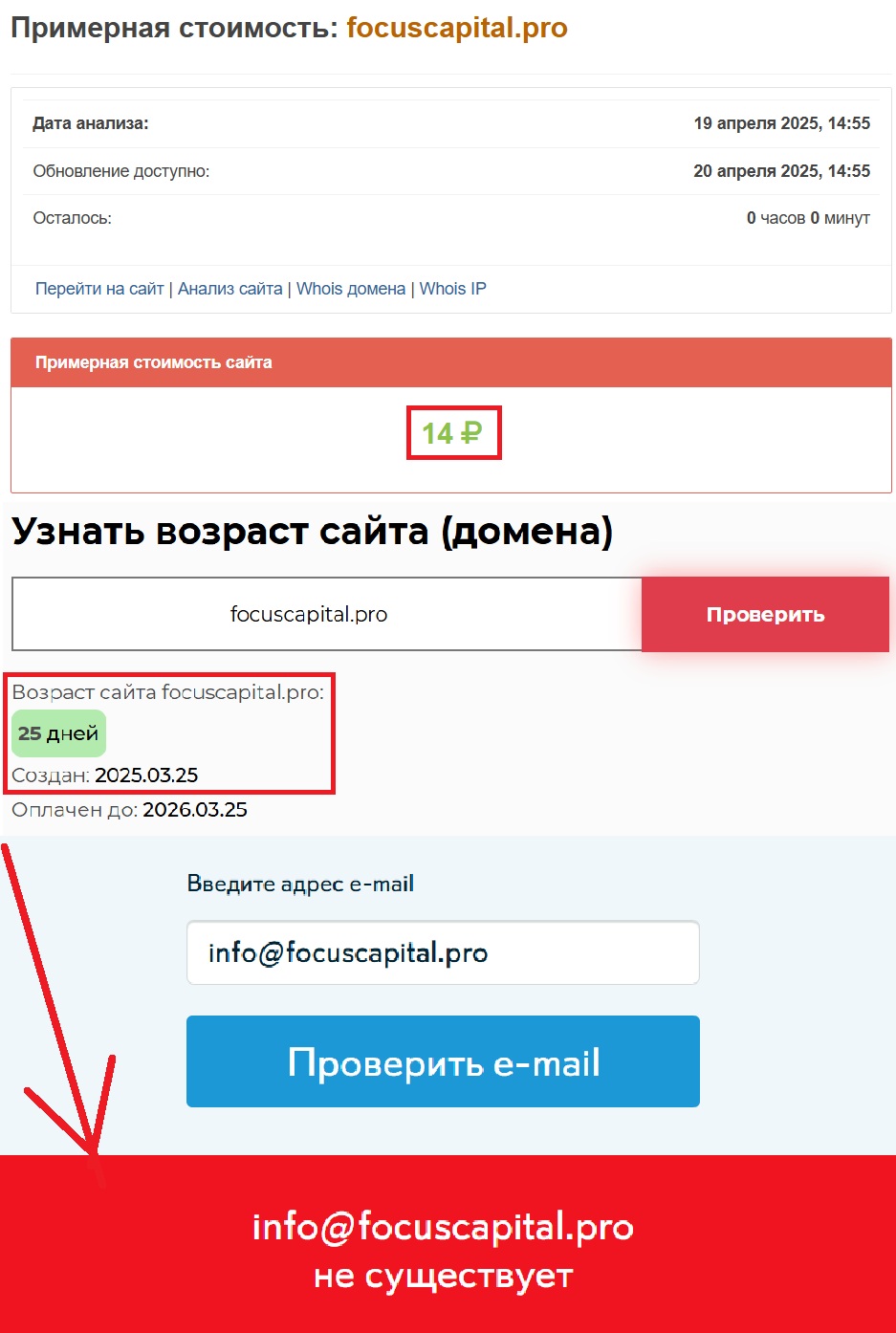 Теперь немного о сроках. Ведь сколько работает компания — это тоже важный момент, который способен многое прояснить. Так вот, Focus capital существует в онлайне всего 25 дней. Это даже не месяц. Разве можно говорить о каком-то опыте, когда ты вчерашний новичок? А если к этому добавить информацию о том, что стоимость домена — всего 14 рублей, становится совсем печально. Какой уважающий себя брокер будет экономить на базовых вещах? Ни один.