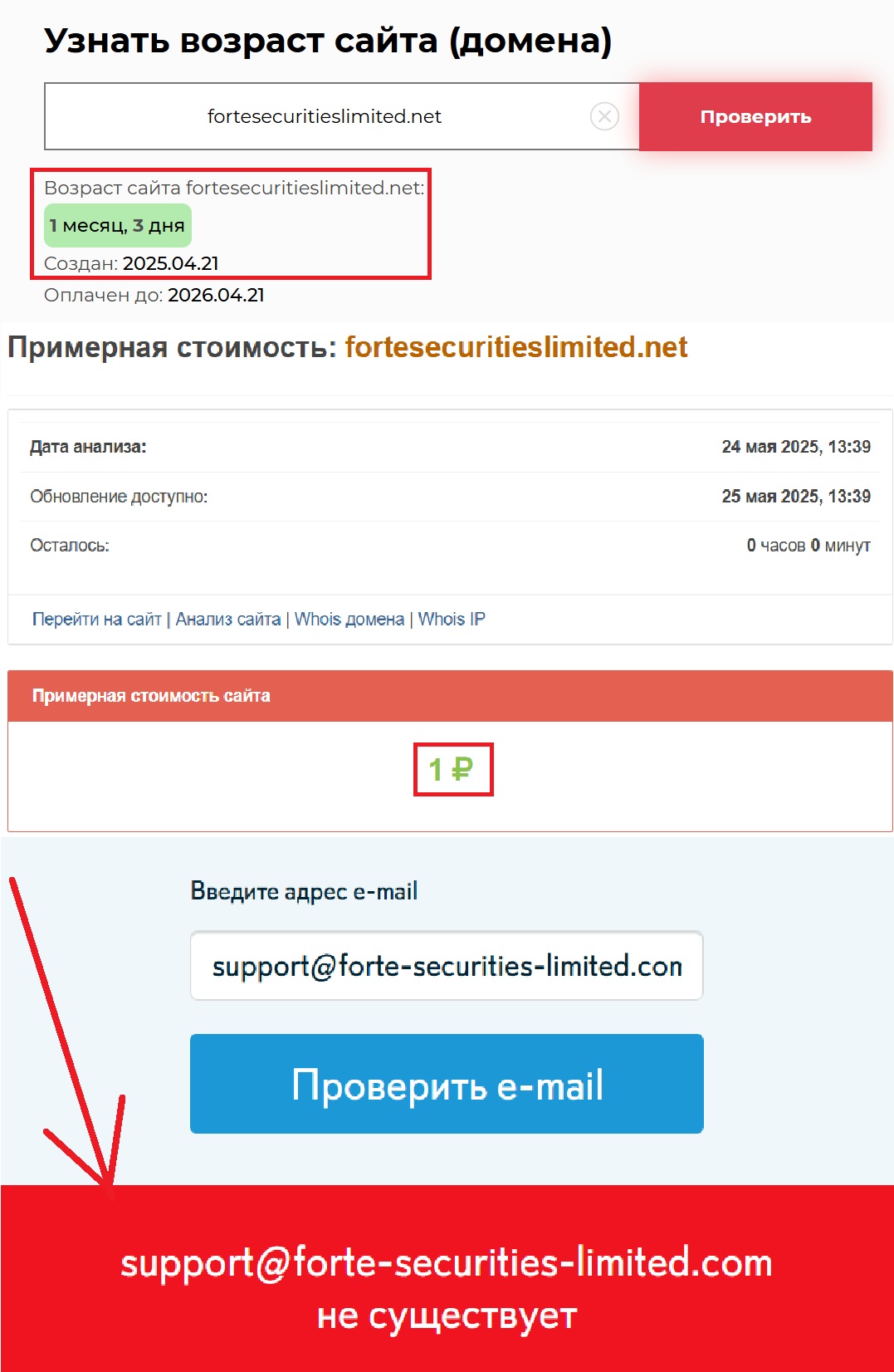 Что особенно раздражает — это наглость, с которой FORTE SECURITIES LIMITED приписывает себе «сотни тысяч пользователей», «успешные сделки», «многолетний опыт». На деле же — пустота. Обычный новодел. Кстати, домен зарегистрирован буквально 1 месяц и 3 дня назад. Разве это срок, чтобы называть себя «опытным игроком рынка»? Конечно, нет. Более того, цена вопроса — один рубль. Какой серьезный бизнес можно построить на такой основе? Да никакой.