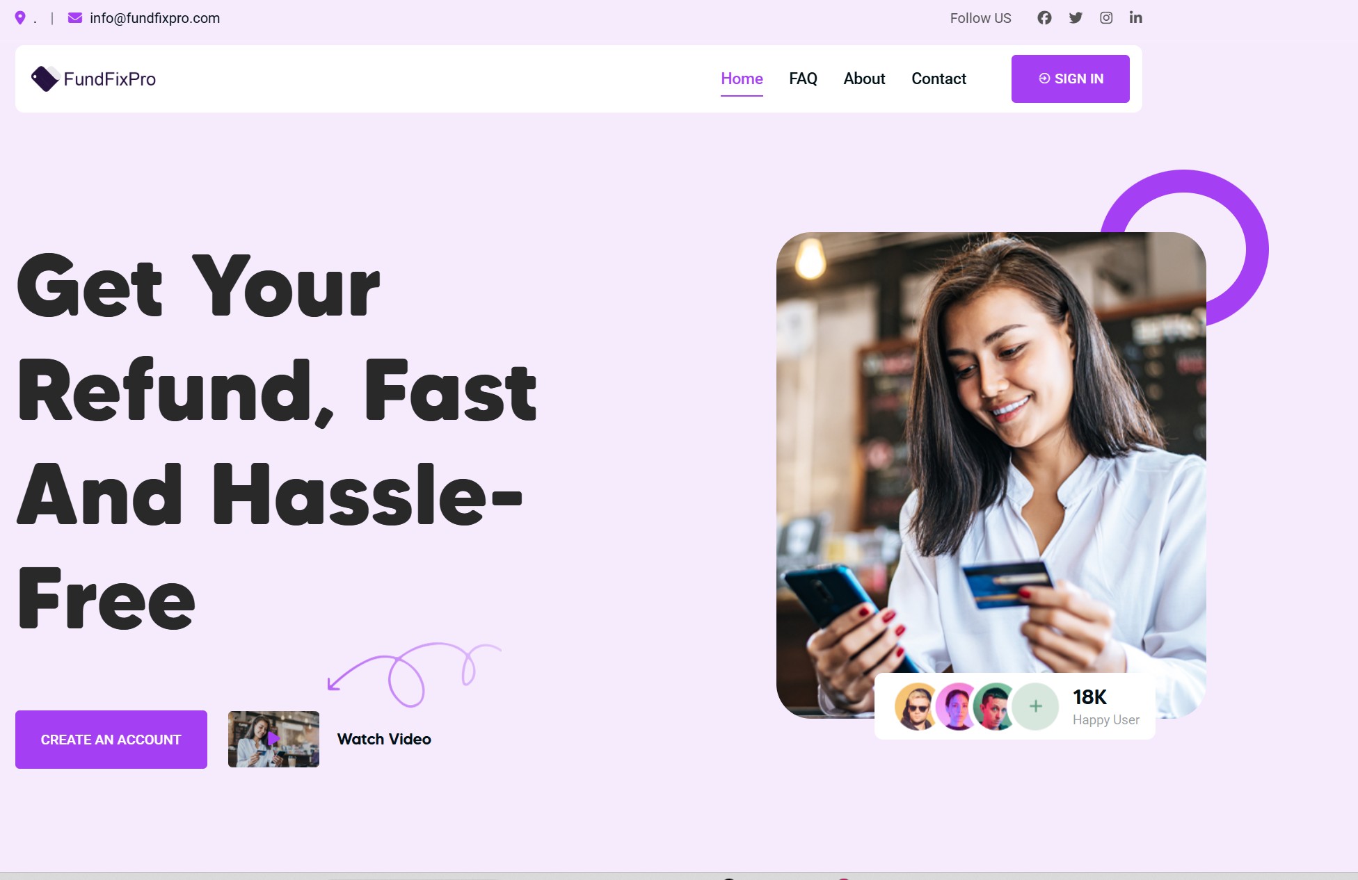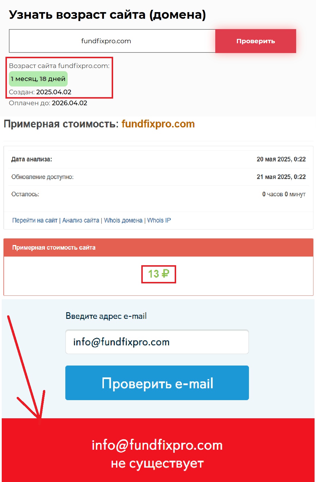 Контактные данные? Тоже все, мягко говоря, липовое. Электронная почта, указанная на сайте — info@fundfixpro.com — мертва. Письма туда не доходят, ответа вы не получите. Номер телефона — фикция. Ни одного упоминания, ни одного связанного юридического лица. Ноль.