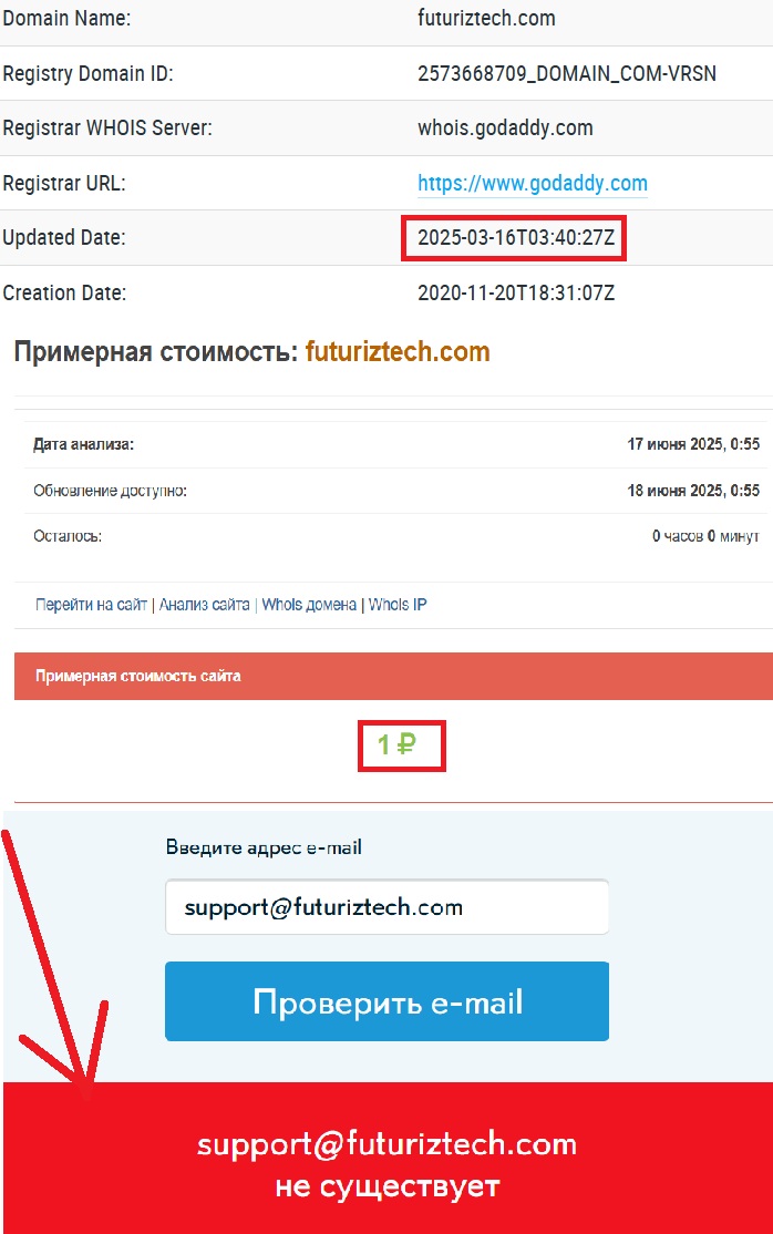 Мы решили проверить проект через сервис Whois. Результат оказался еще более настораживающим — Futuriztech существует всего 3 месяца и 2 дня. Это слишком мало для легальной и надежной компании. Стоимость домена при этом равна одному рублю — логично, что рассчитывать на выплаты от такого ресурса не приходится. Что касается контактных данных, их просто нет или они полностью нерабочие, так что дозвониться или написать для уточнения информации не представляется возможным. Даже элементарная почта support@futuriztech.com оказалась фейковой.
