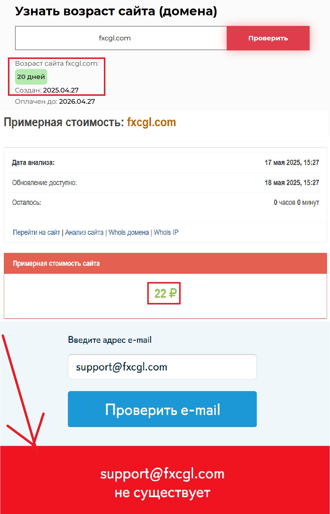 Мы провели дополнительную проверку через сервисы Whois и Seolik. Что ж, картина оказалась предсказуемой. Сайт был запущен недавно — буквально 20 дней назад, в конце апреля 2025 года. За это время невозможно создать качественный финансовый сервис, а мошенникам и не нужно. Их задача — быстро собрать деньги и исчезнуть. Никакой поддержки, никакого сервиса, никакой ответственности. Контактная информация? Ее попросту нет. Ни телефона, ни офиса. Есть только фальшивая почта support@fxcgl.com. Пишите хоть сто писем — ответа не будет. А если будет, то, скорее всего, автоматическая отписка.