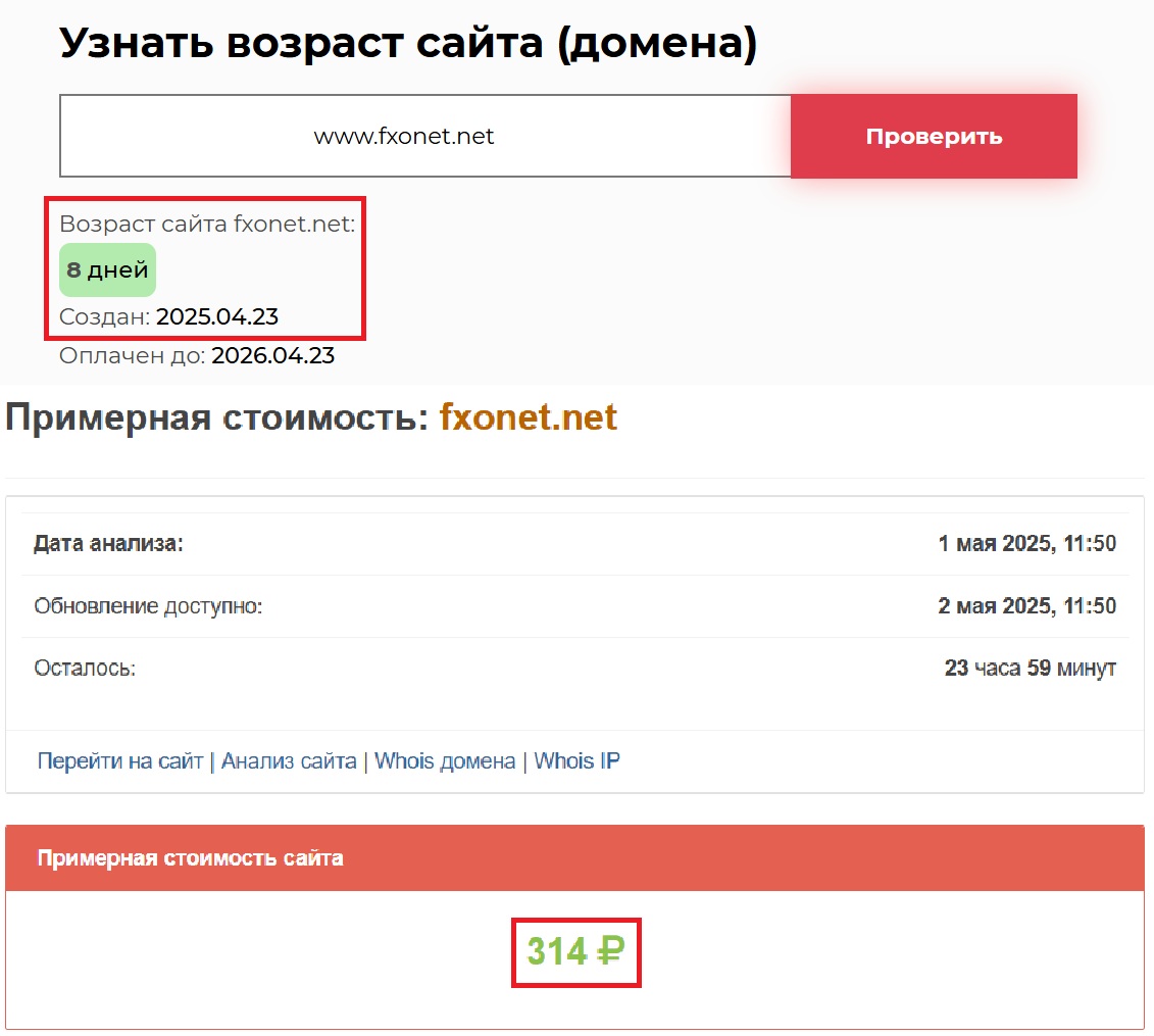И еще один момент, на который стоит обратить внимание. Дата появления в сети — 23 апреля 2025 года. На момент нашего обзора проекту нет и двух недель. Серьезно? Они пытаются убедить нас в своей надежности, а работают столь малый срок? Это, если мягко сказать, вызывает сомнения. Настоящие компании строят репутацию годами. А тут даже и года не прошло. Более того — стоимость домена, как ни парадоксально, всего 314 рублей. То есть настолько мало они вложили в «бизнес», который якобы приносит миллионы? Разве в это можно поверить?