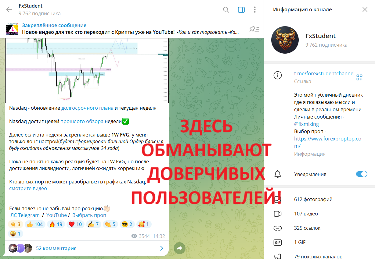 Это одна из популярных современных схем обмана, которую активно используют многие злоумышленники. Все они создают в Телеграм каналы, выдают якобы о себе несколько неподтвержденных фактов, скрывают лица. Аудитория в их пабликах, как правило, накручена. Реакции и комментарии либо закрыты, либо сильно ограничены и проходят модерацию (именно второй вариант встречается в FxStudent).