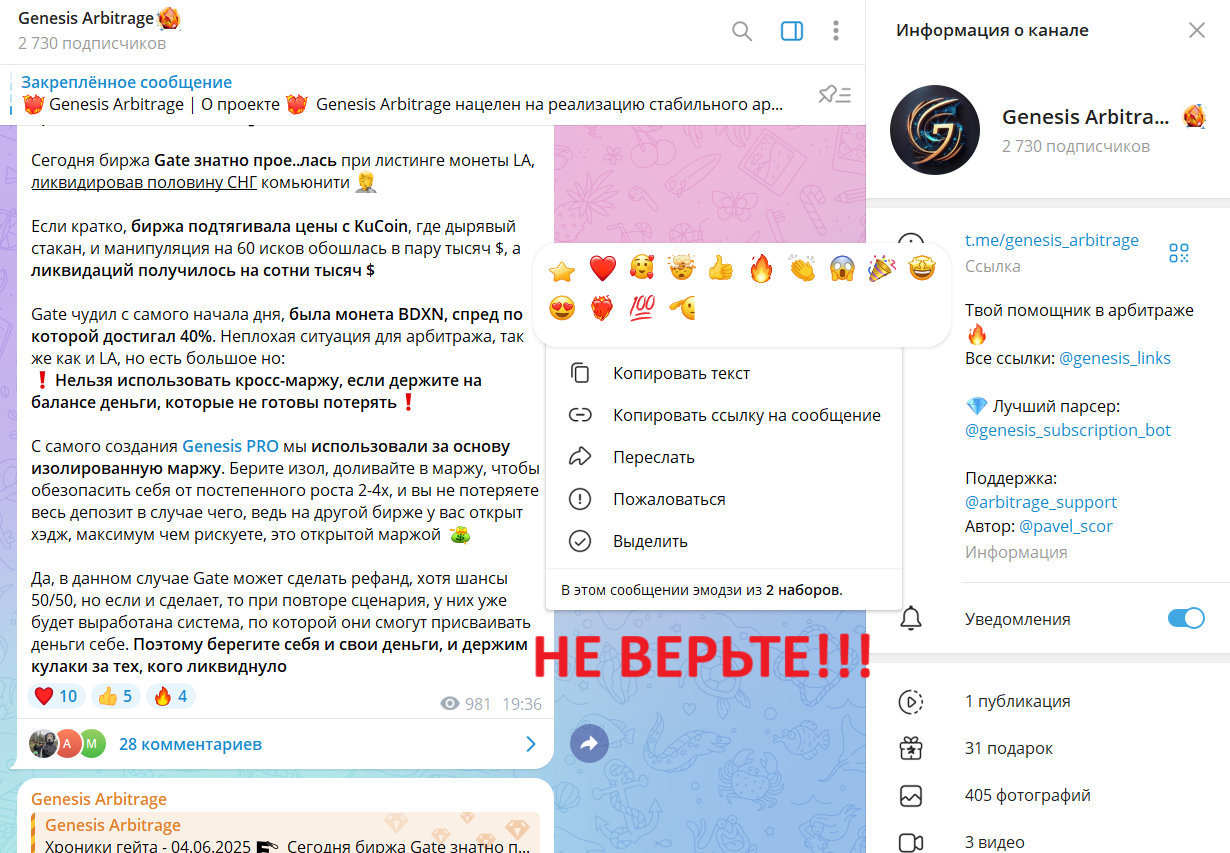Арбитраж криптовалют стал одним из самых популярных методов заработка в последнее время. Соответственно, в сети стало появляться немало проектов, обещающих высокую прибыль на разнице курсов и автоматический заработок. Однако далеко не все из авторов подобных контор имеют благие намерения, предлагая пользователям свою помощь. Например, создателю телеграм-паблика Genesis Arbitrage определенно нельзя доверять.