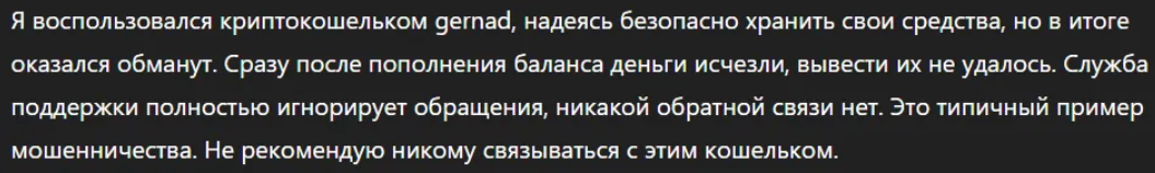Предлагаем обратить внимание и на нереалистичные обещания в Gernad. Жулики громко заявляют о стабильном доходе, высоких процентах, инвестиционных возможностях без рисков. Однако никогда не стоит забывать, что криптовалюта нестабильна. И если кто-то гарантирует вам даже 10% заработка в день — можете начать сомневаться в честности этих людей.