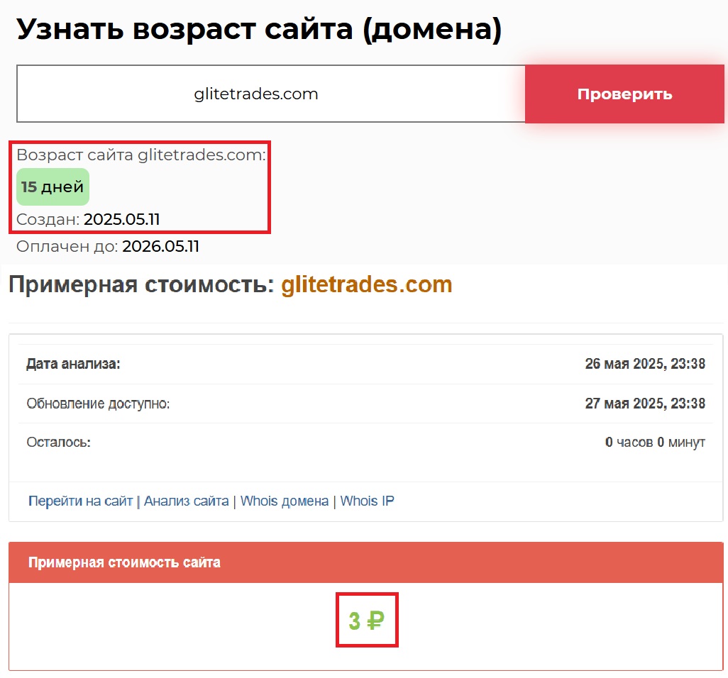 Возраст ресурса — отдельная история. Формально компания существует якобы с 2019 года, но давайте будем честны: реальная активность началась только 15 дней назад 11 мая 2025. То есть, по сути, перед нами новый лохотрон. Странно, правда? И ведь это частая уловка у аферистов — выдать свежесделанный проект за давнюю компанию с «историей».
