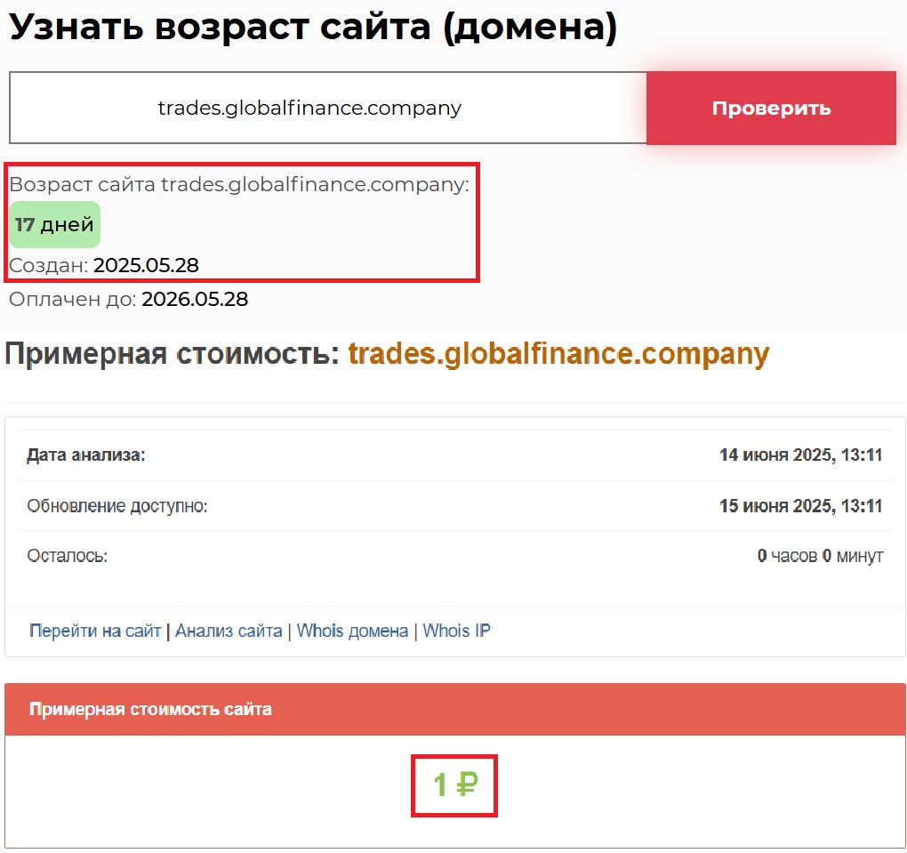 А теперь внимание: лицензии. Тема, которую стараются замылить или просто обходят стороной. Хотя это — ключ к безопасности. У GLOBAL FINANCE, как несложно догадаться, никакой лицензии нет и в помине. Проверка сторонними сервисами показывает нам, что герой данного обзора не только схалтурил с лицензиями, он еще и использует примитивный и дешевый веб-ресурс за один рубль. Появилась эта клоунада 17 дней назад, то есть 28 мая 2025 года.