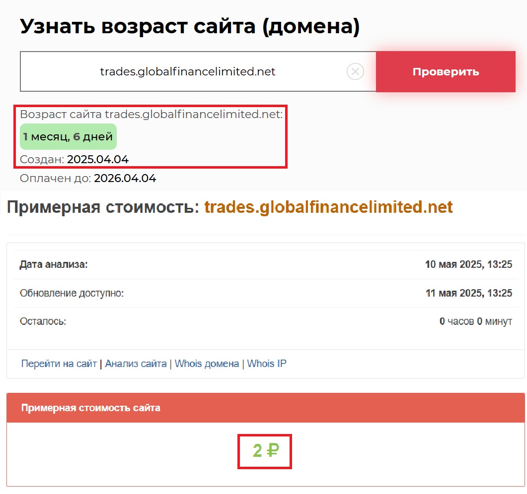 А теперь самое интересное — документы. Точнее, их отсутствие. Ни лицензии, ни разрешений, ни даже упоминаний. А ведь это уже не недоразумение, это вполне конкретный и тревожный сигнал: перед нами — нелегальная структура. Срок существования тоже вызывает вопросы. Вроде как нам рассказывают о большом опыте: мол, компания давно на рынке. Но нет. Если копнуть глубже, становится ясно — домен зарегистрирован всего 1 месяц и 6 дней назад, то есть 4 апреля 2025 года.