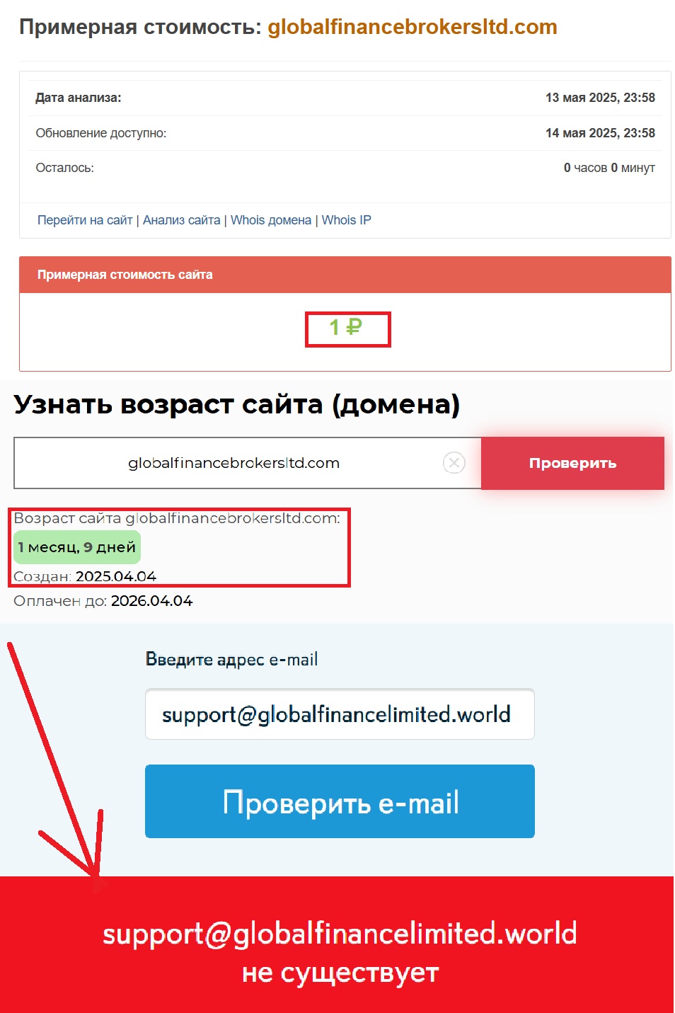 А теперь немного цифр. Домен был зарегистрирован 4 апреля 2025 года. Почтенный возраст, правда? Почти два месяца на рынке. Да это смешно, особенно если сравнивать с возрастом реальных бирж и брокеров, которые хорошо себя зарекомендовали. Так зачем рассказывать сказку о работе еще с 1996 года? Чтобы создавалось впечатление: мол, мы тут давно, мы — надежные. На деле же — дешевая подмена. И, к слову, обошелся этот «престижный» адрес в один рубль. Ну, вы поняли.