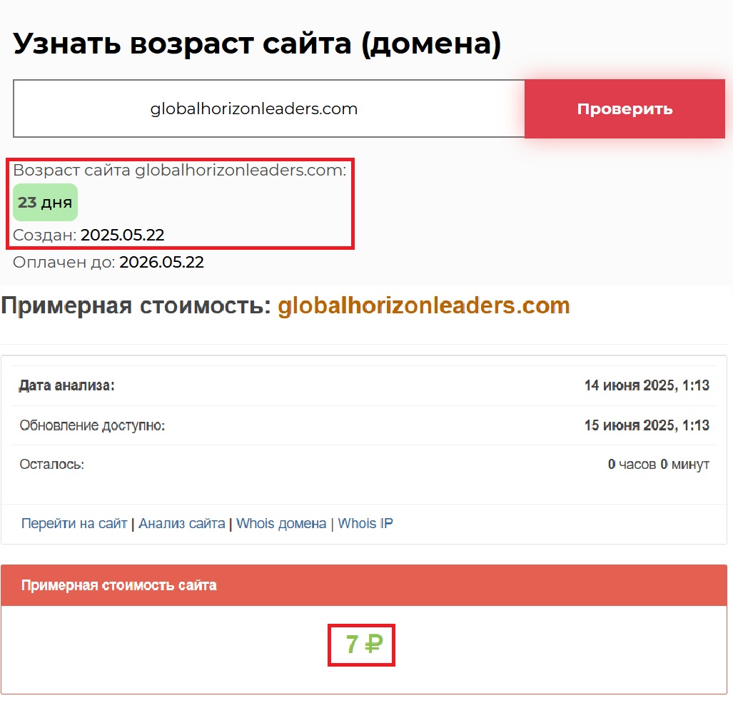 Проверка домена выдала, что проект начал работать совсем недавно — всего лишь с 22 мая 2025 года, то есть чуть больше трех недель назад. При этом он гордо заявляет о многолетнем опыте, что выглядит по меньшей мере сомнительно. Стоимость домена — всего семь рублей, и это хорошо говорит о серьезности проекта.