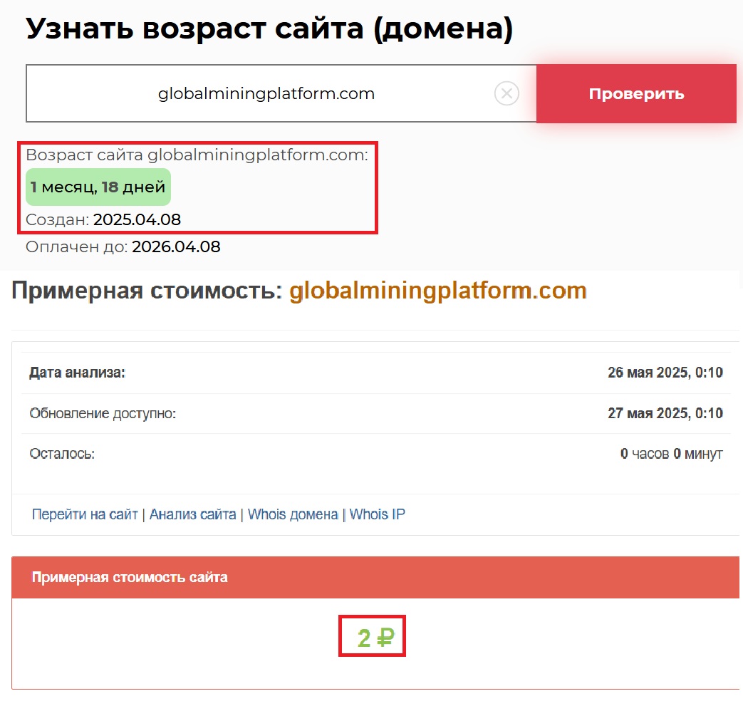 Сколько лет проекту? Ну, технически домен зарегистрирован 1 месяц и 18 дней назад, то есть 8 апреля 2025 года. А весь многолетний опыт» — просто фальшивая обертка, созданная для доверчивых глаз. И тут еще одна деталь: стоимость этой «площадки» — ровно два рубля. Платформа не представляет собой никакой ценности, и это видно невооруженным глазом. Не потому что мы так сказали — потому что она действительно ничего не стоит. И тем не менее, люди продолжают туда нести деньги, веря в волшебные проценты.
