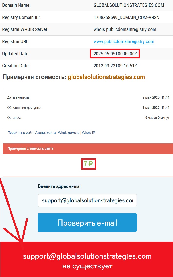 Стоимость платформы, по оценке аналитических сервисов, едва дотягивает до семи рублей. Вот просто подумайте. А теперь задайте себе вопрос: готовы ли вы доверить свои сбережения проекту, который стоит подобную сумму? Последним гвоздем в крышку гроба этого финансового лохотрона является контактная информация, представленная в виде фейковой почты support@globalsolutionstrategies.com.