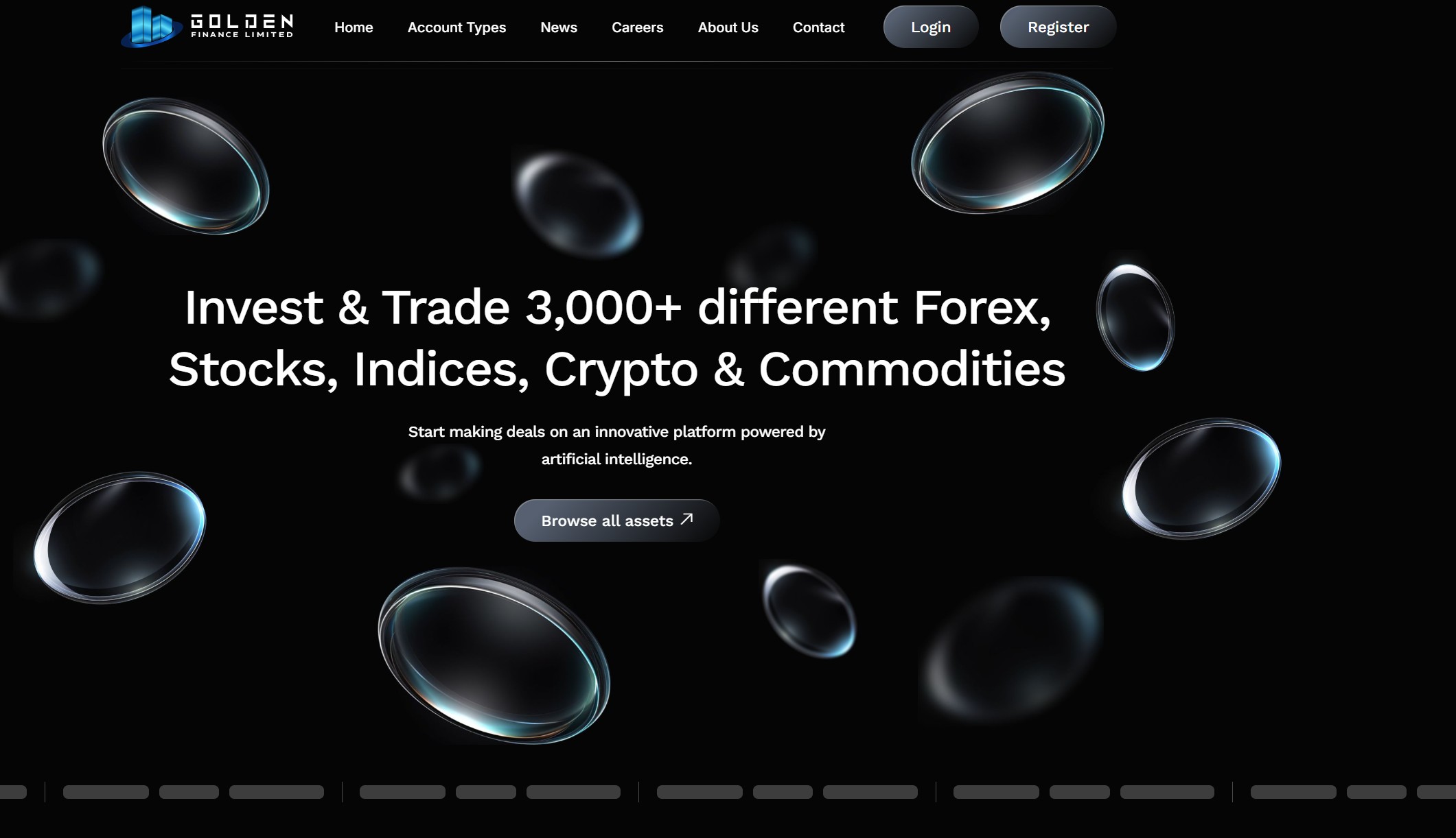 Ресурс, с которым мы имеем дело, расположился по адресу goldenfinancelimited.com. Название, прямо скажем, громкое. А вот реализация — на удивление дешевая. Если вы хотя бы немного знакомы с устройством финансовых сайтов, то сразу поймете: тут сэкономили на всем. Интерфейс — убогий. Половина разделов не открывается, другая половина — пуста или содержит настолько общие слова, что от них больше вопросов, чем ответов.