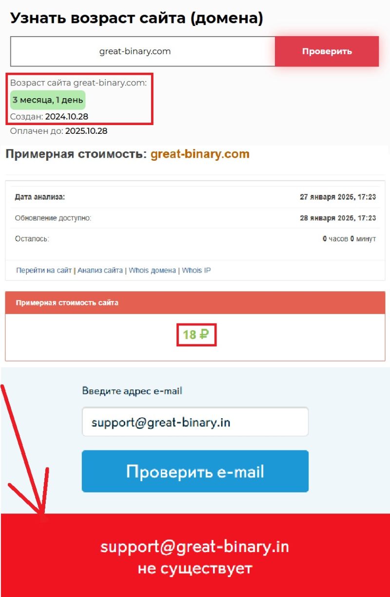 Проверка специальными сервисами показывает, что домен GreatBinary появился в сети 28 октября 2024 года, то есть 3 месяца и 1 день назад. Согласитесь, это явно не тот срок, на который вы можете рассчитывать. Ничто не мешает мошенникам закрыться в любой момент и оставить вас ни с чем. К тому же сервис Seolik демонстрирует нам стоимость в 18 рублей. Разве за такие деньги пользователи могут рассчитывать на профессионализм и большие выплаты?